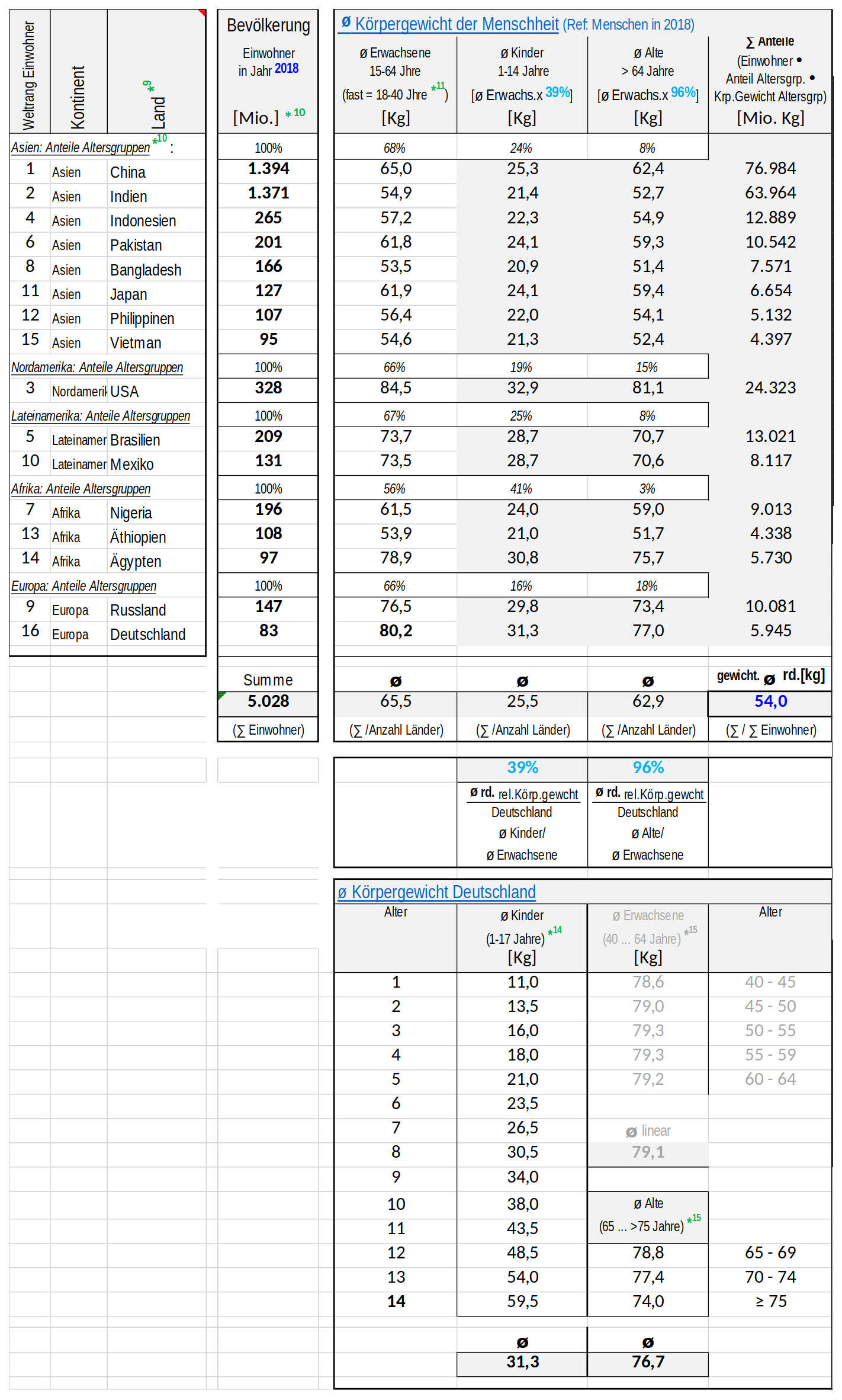 (Gewichteter Mittelwert des durchschnittlichen Körpergewichtes (ohne dessen Wasseranteil) aller Menschen in den 16 bevölkerungsreichsten Ländern mit insgesamt ca. 5 Milliarden Einwohnern in 2018. Die Gewichtung erfolgte auf Basis der Gesamt-Bevölkerungszahl je Land unterteilt in die Altersgruppen „Kinder“, „Erwachsene im arbeitsfähigen Alter“, „Alte“ *9,10 (siehe Anhang):
